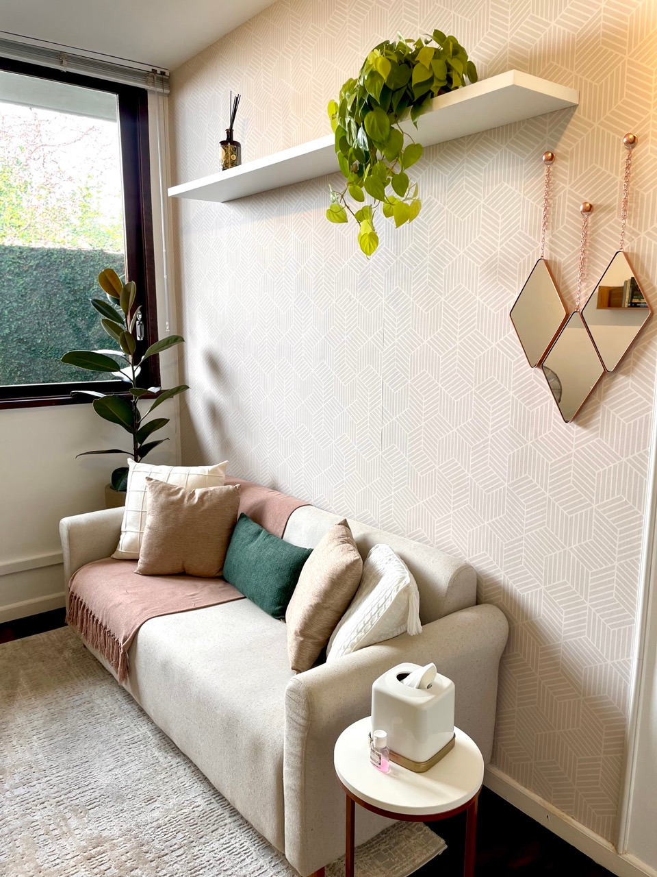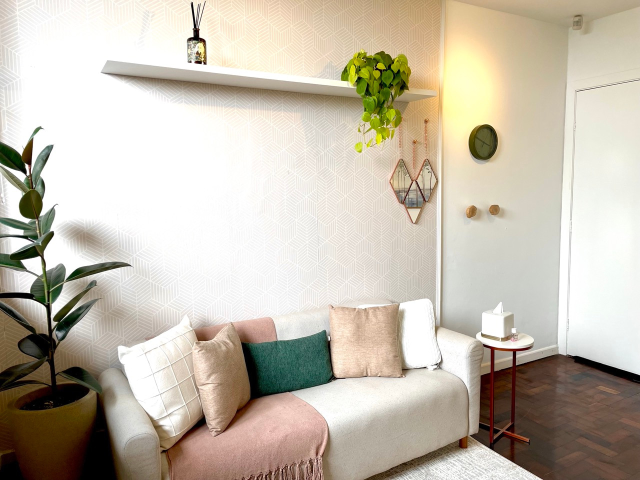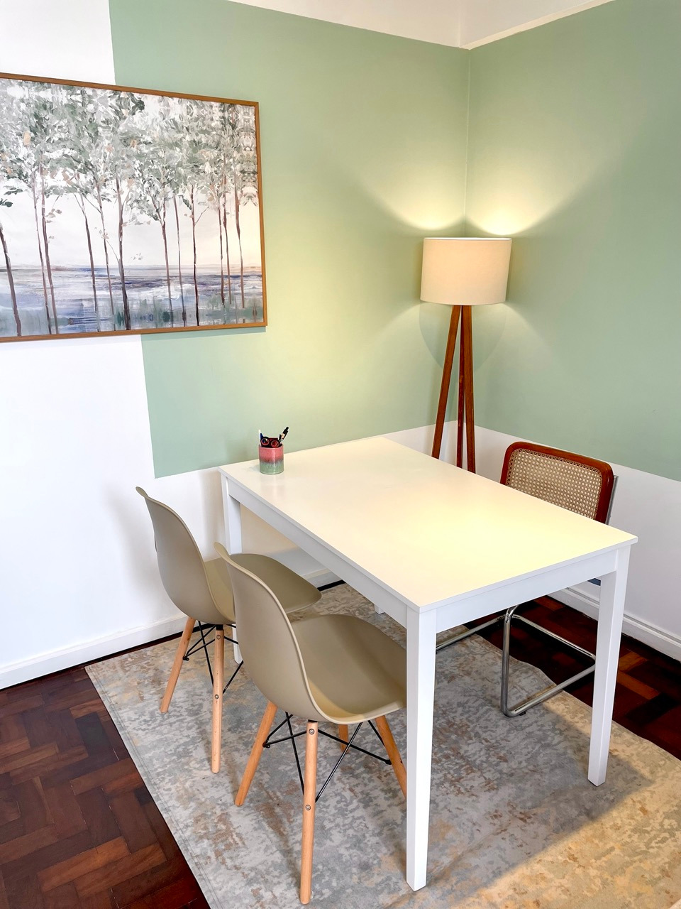 Sala muito aconchegante, mobiliada e decorada, para atendimento de adultos, atendimentos on-line e testagem psicológica.